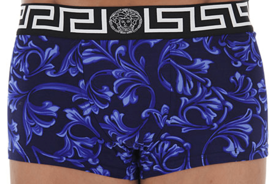 “Boxer taille basse avec le Versace Greek sur l’Elastique. Motif Baroque avec touché doux. Fabriqué en Italie.”