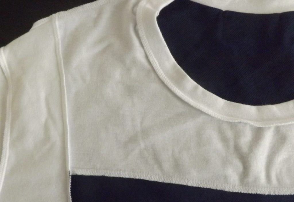 La deuxième version du T-shirt Jeremy est la version “tablier blanc”. C’est le même principe que pour le premier T-shirt. Cette fois-ci, vous pouvez utiliser le T-shirt comme d’une pièce blanche basique. Le piqué de coton bleu marine assure une belle tenue sur les épaules et un élargissement du buste.