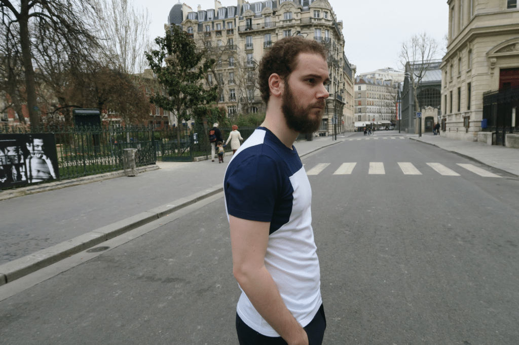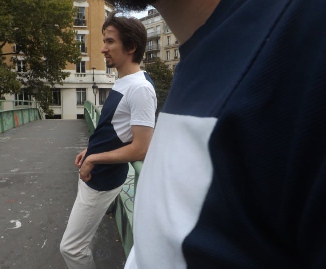 Les deux T-shirts sont disponibles dans deux coloris différents (nous avons donc quatre T-shirts en tout). Le T-shirt Jeremy est disponible avec un piqué de coton bleu marine présent sur tout le buste, c’est la version “tablier bleu“.