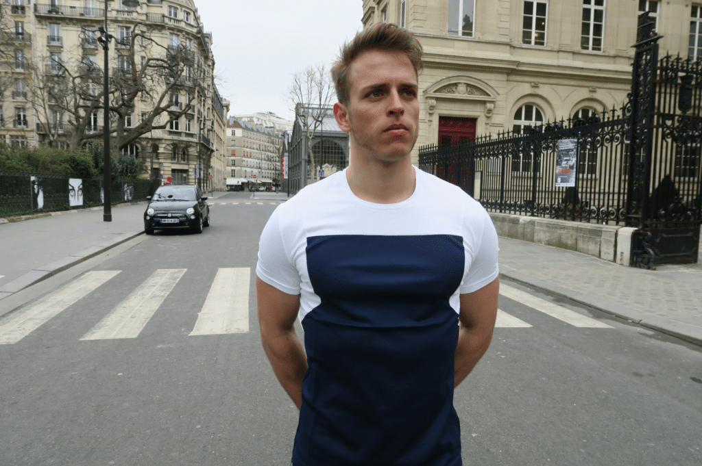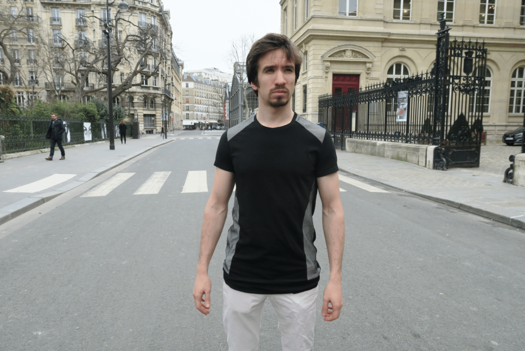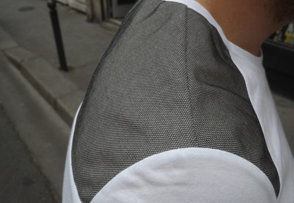Pour le second T-shirt, Adrien souhaitait beaucoup plus urbain, streetwear, et plutôt long. Nous avons longuement cherché avec Sébastien des moyens de rendre le T-shirt portable seul ou en première couche, en travaillant le placement des empiècements et la coupe du T-shirt. Enfin, il nous a fallu retravailler le prototype pour que le T-shirt soit confortable au bassin, sans gêner les mouvements quotidiens.