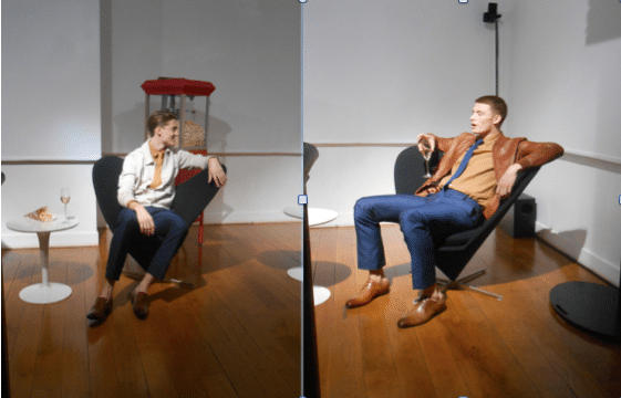 On observe le mannequin au second plan l’air effrayé en train de desserrer le col de sa chemise. On ne peut qu’imaginer un interrogatoire entre un détective et un suspect. Peut-être une enquête pour un crime ? Ou une négociation d’un contrat un peu mouvementée ?