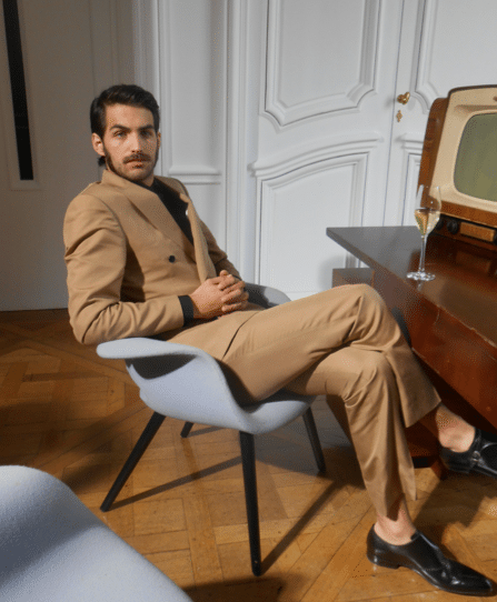 Association très sobre entre le costume à veste croisée beige – la veste croisée est le symbole de la maison Smalto – et la chemise et les chaussures à boucles noires.